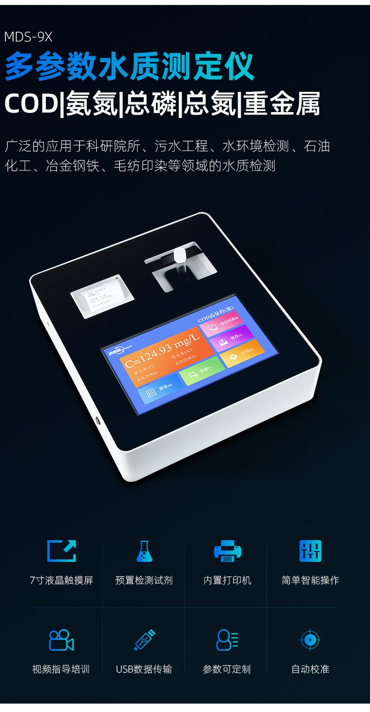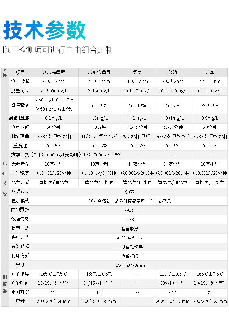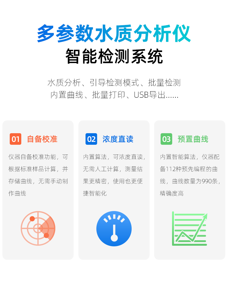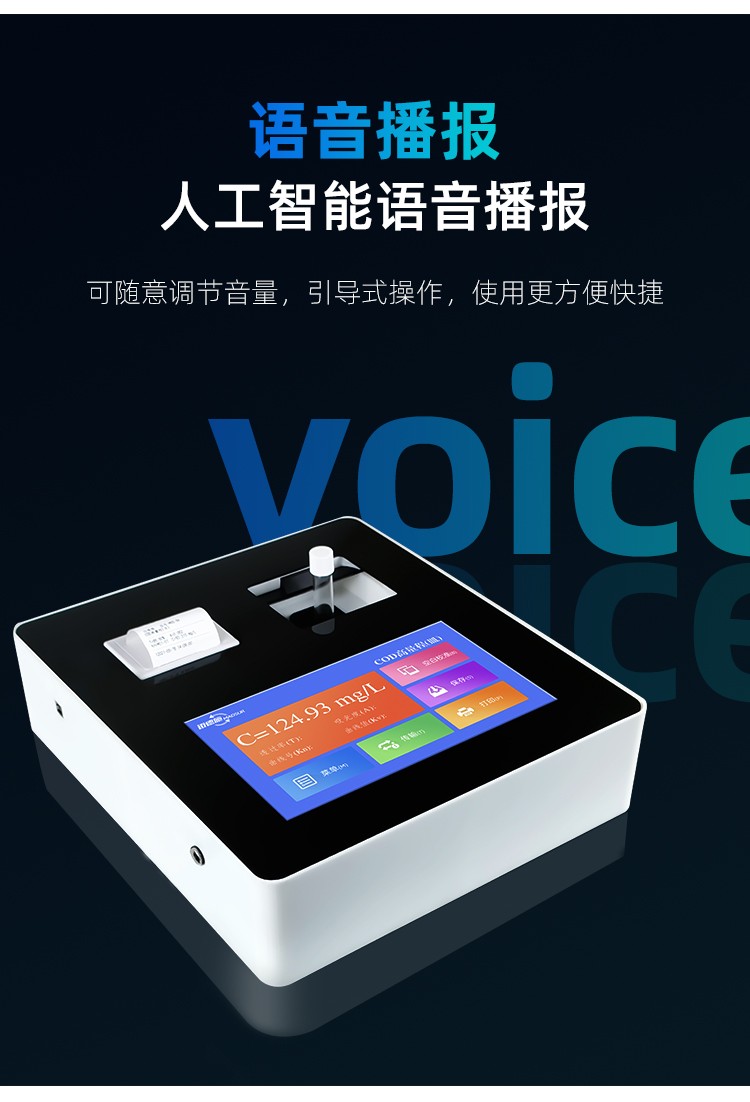 人工智能語音播報提示,可隨意調(diào)節(jié)音量, 使用更方便更 配備112種預(yù)先編程的曲線,曲線數(shù)量990條,可濃度直讀,測量結(jié)果更精密; 具有數(shù)據(jù)存儲功能,可存儲90萬組數(shù)據(jù),并能自由查看; 10寸彩色液晶顯示觸摸屏,全中文操作模式,更便于操作掌握; 儀器自備校準(zhǔn)功能,可根據(jù)標(biāo)準(zhǔn)樣品計算, 并存儲曲線,無需手動制作曲線; 配備USB接口傳輸功能,自帶打印機,可打印當(dāng)前數(shù)據(jù)及存儲的歷史數(shù)據(jù); 采用管比色、皿比色,雙比色系統(tǒng)